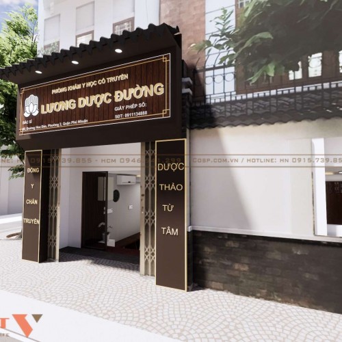 Ngoài biển bảng chính thì hai cột hai bên lối vào phòng khám được trang trí với các chữ "ĐÔNG Y CHÂN TRUYỀN" và "DƯỢC THẢO TỪ TÂM”. Đây là phương án để chủ đầu tư muốn nhấn mạnh phương pháp chữa bệnh dựa trên đông y và dược liệu tự nhiên.