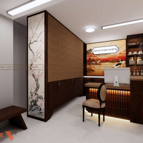 Trong phòng khám, các bức tranh thảo mộc, bức thư pháp cổ điển.. được trang trí sẽ giúp không gian thêm phần sinh động và mang đậm nét văn hóa y học cổ truyền. Màu sắc chủ đạo nên là các tông màu ấm như vàng, nâu để tạo cảm giác thư giãn cho bệnh nhân.