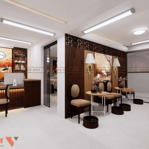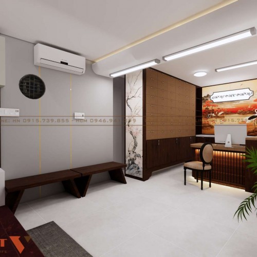 Khu vực lễ tân là nơi hỗ trợ khách hàng đầu tiên nên cần mang lại cảm giác thoải mái và thân thiện. Phong cách thiết kế kết hợp giữa các yếu tố truyền thống của y học cổ truyền và sự tiện nghi hiện đại.