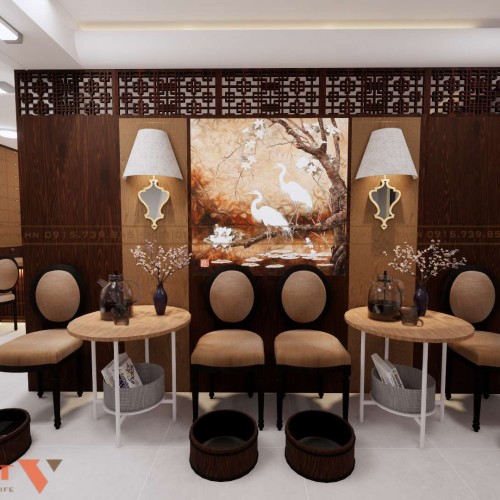 Khu vực ngâm chân có ghế ngồi êm ái để nhân viên phòng khám hỗ trợ thuận tiện chăm sóc cho bệnh nhân. Phía sau là vách trang trí có các họa tiết ấn tương tăng điểm nhấn thu hút ánh nhìn.