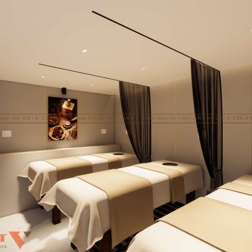 Giường châm cứu được thiết kế chắc chắn, thoải mái có đệm êm ái. Giường làm từ gỗ tạo sự vững chãi và đáng tin cậy. Mỗi giường châm cứu được ngăn cách với nhau bằng các tấm rèm nhẹ hoặc vách ngăn gỗ để đảm bảo tính riêng tư cho bệnh nhân.