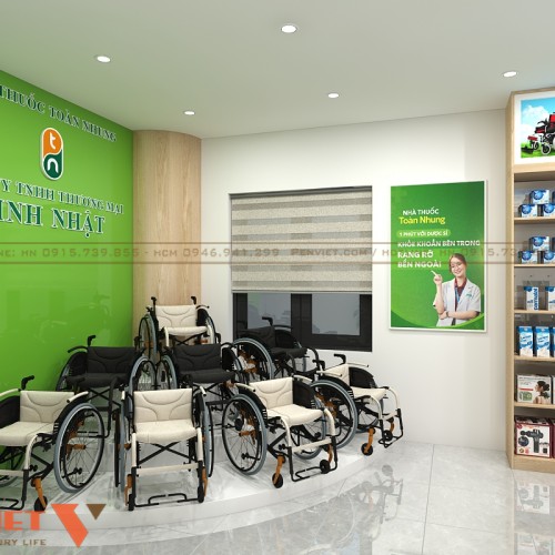 Một khu riêng được bố trí cho thiết bị y tế như xe lăn. Sản phẩm được sắp xếp theo cụm, tạo điểm nhấn rõ ràng. Kệ gỗ kết hợp ánh sáng giúp tăng giá trị trưng bày. Cách bố trí này giúp mở rộng danh mục kinh doanh.