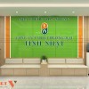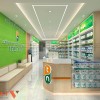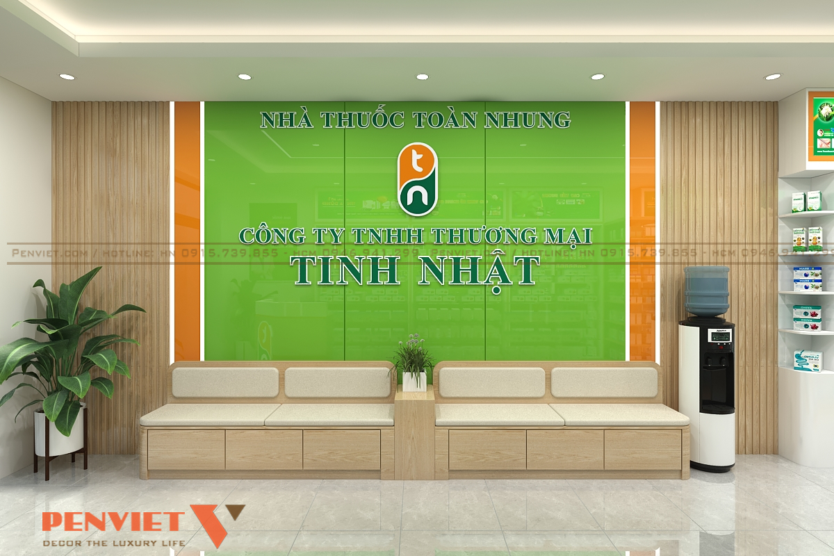 Ánh sáng trắng được bố trí đều trên trần, tạo cảm giác sạch sẽ. Trần phẳng kết hợp đèn âm giúp không gian gọn gàng. Màu xanh chủ đạo mang lại cảm giác tin cậy. Tổng thể phù hợp với đặc thù ngành dược.
