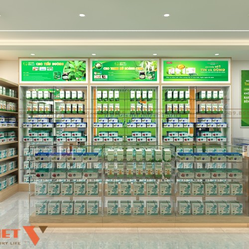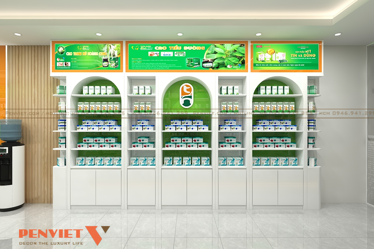 Khu trưng bày được thiết kế theo dạng mở, lối đi rộng và dễ quan sát. Hệ tủ kính trong suốt giúp khách nhìn rõ sản phẩm từ nhiều góc. Các kệ được chia tầng khoa học, phân nhóm thuốc rõ ràng. Điều này giúp khách dễ tìm và giảm thời gian tư vấn.