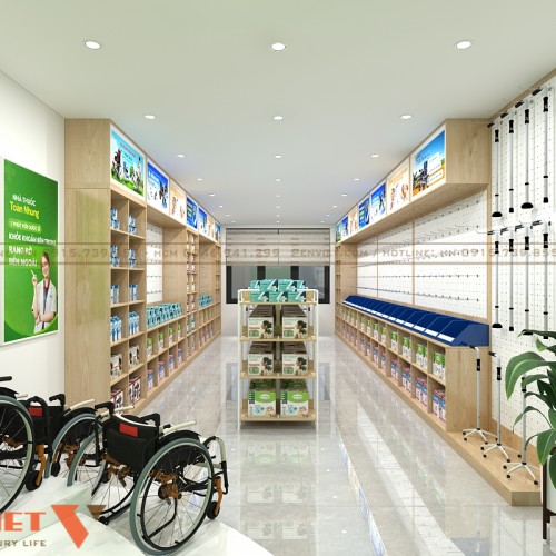 Ngoài ra, các sản phẩm chăm sóc sức khỏe cũng được trưng bày riêng biệt. Bảng quảng cáo treo tường hỗ trợ truyền thông trực quan. Khách hàng dễ tiếp cận thông tin. Không gian vì thế trở nên chuyên nghiệp hơn.