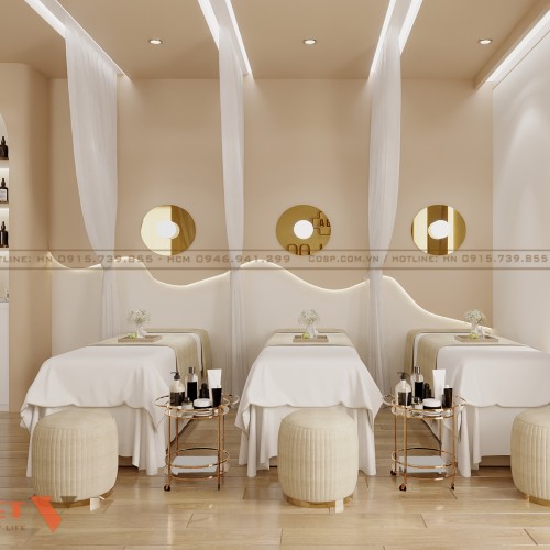 Các giường massage được bọc nệm mềm mại với màu be dịu nhẹ hài hòa với tổng thể không gian. Bên cạnh đó, các chi tiết trang trí như rèm cửa, tấm thảm trải sàn hay đèn chiếu sáng cũng được chọn lựa kỹ lưỡng để phù hợp và đồng nhất.