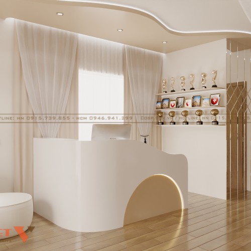 Điểm nhấn trong thiết kế trang trí của spa Bình An chính là các quầy kệ trưng bày sản phẩm bằng gỗ MDF. Hay những kệ trưng bày kỷ niệm chương, cúp lưu niệm của spa ở những vị trí thích hợp rất tinh tế.