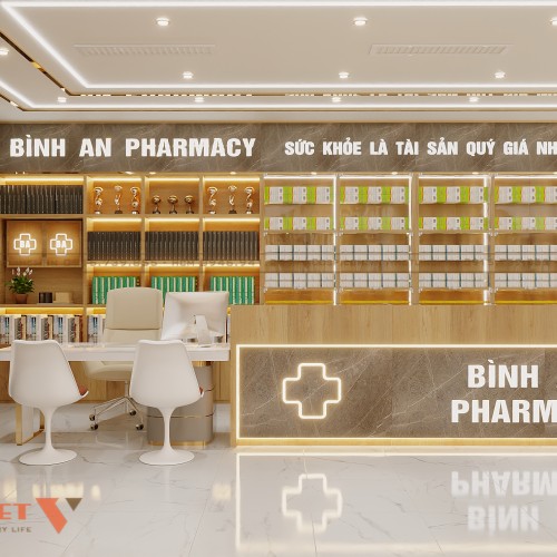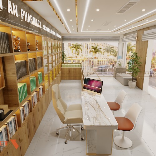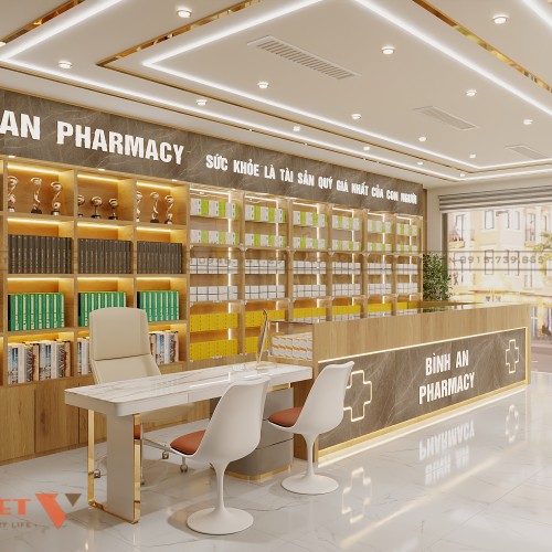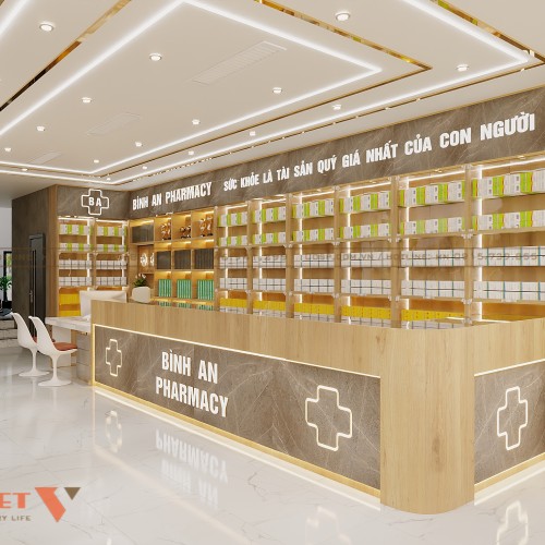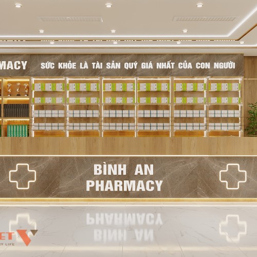 Nhà thuốc Bình An được thiết kế với phong cách hiện đại, mới mẻ khác biệt hoàn toàn so với các nhà thuốc truyền thống. Ví dụ như sử dụng tone gỗ ấm áp hay các chi tiết trang trí tinh tế trong đồ nội thất. Điều này giúp nhà thuốc Bình An toát lên sự sang trọng và gần gũi thu hút khách hàng khi đến mua thuốc. Điểm nhấn nổi bật là chi tiết nẹp viền trang trí vàng gold trên các hệ quầy tủ tại nhà thuốc.