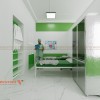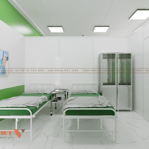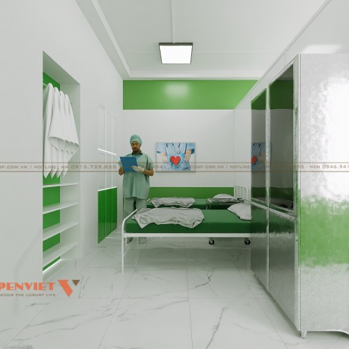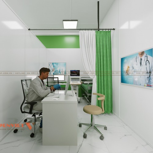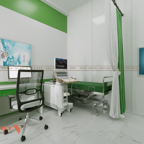 Khu vực phòng siêu âm có đầy đủ máy móc, bàn tư vấn để hỗ trợ bệnh nhân. Hệ thống đèn chiếu sáng trắng dịu nhẹ được sử dụng hài hòa giúp không gian phòng siêu âm trở nên sáng sủa hơn. Màu xanh lá được chọn làm màu chủ đạo tạo nên sự mới mẻ và tươi mát cho không gian.