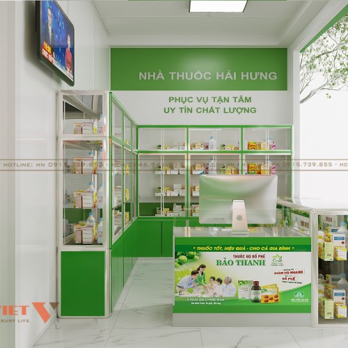 Quầy thuốc được đặt ngay tại vị trí cửa ra vào để nhân viên dễ dàng giao tiếp và hỗ trợ khách hàng ngay từ khi bước vào. Hệ quầy thuốc sử dụng chất liệu kính trong suốt giúp trưng bày sản phẩm dễ dàng và chuyên nghiệp. Phía sau là tủ thuốc được thiết kế với nhiều tầng để sắp xếp gọn gàng dược phẩm giúp nhân viên thuận tiện khi lấy tư vấn khách hàng.