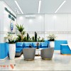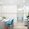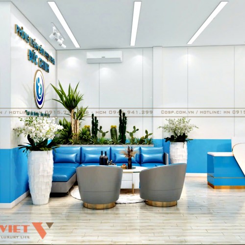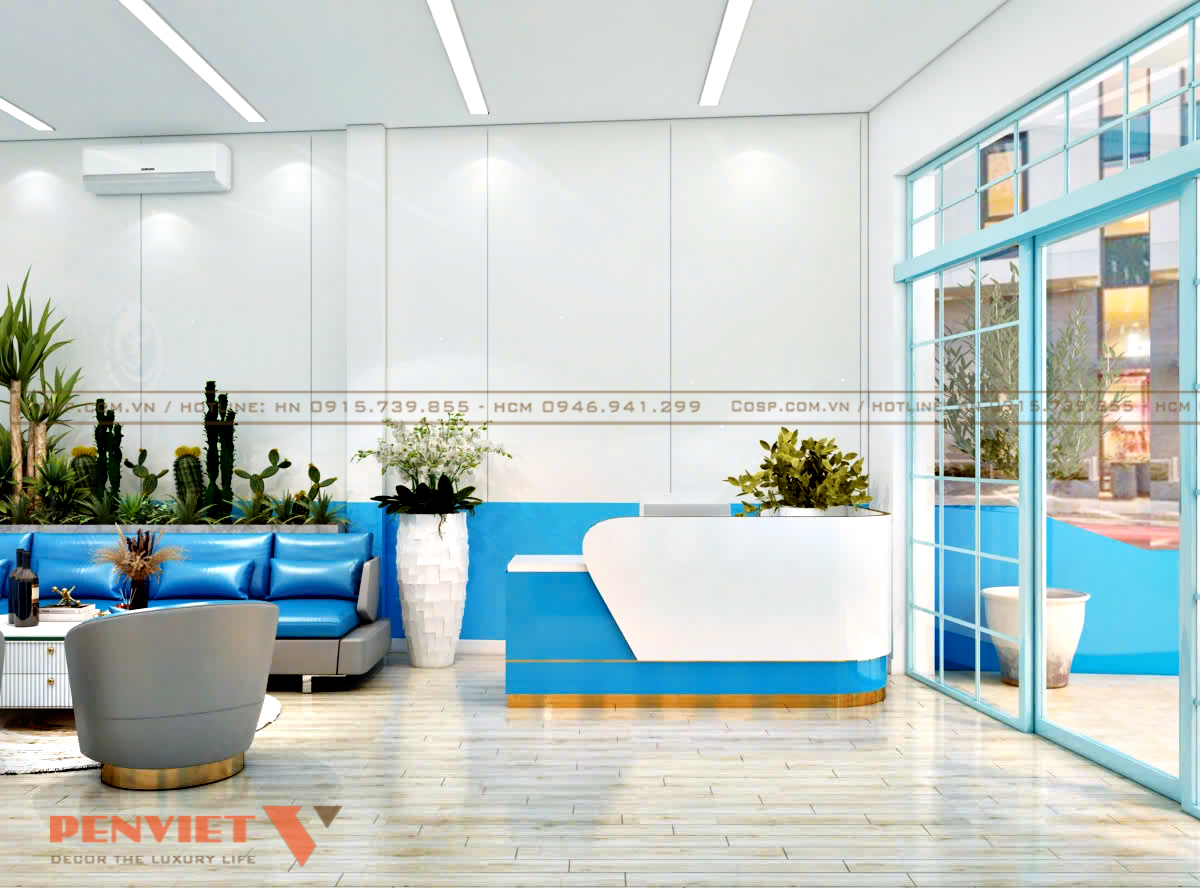 Quầy lễ tân là nơi tạo ấn tượng đầu tiên với bệnh nhân khi đến thăm khám bệnh. PenViet sử dụng bộ sofa màu xanh dương kết hợp với bàn trà màu trắng đặt ở trung tâm khu vực tiếp khách. Ngoài ra còn trang trí các chậu cây xanh nhỏ xung quanh để mang lại cảm giác tự nhiên, giảm căng thẳng cho bệnh nhân.