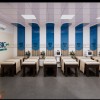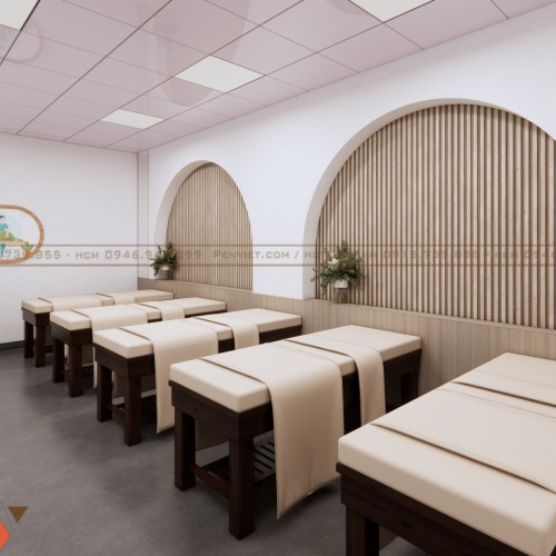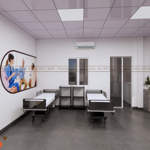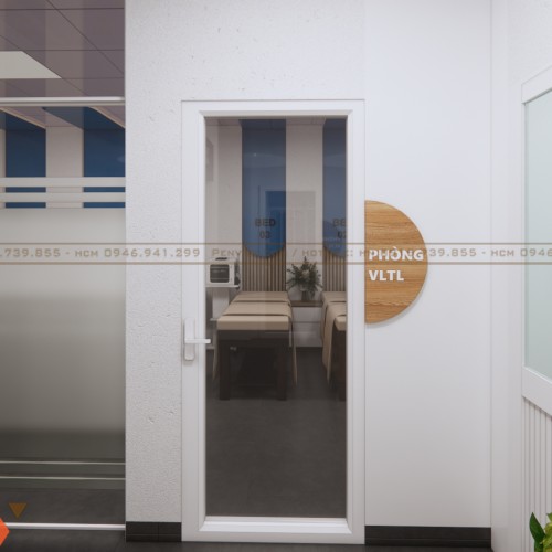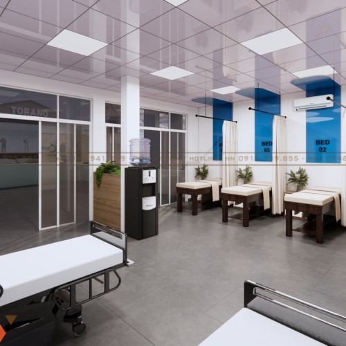 Đây là khu vực quan trọng của phòng khám, được chia thành nhiều giường đơn đặt song song. Thiết kế nội thất theo hướng tối giản, gọn gàng và đồng bộ. Giường gỗ công nghiệp phủ màu sẫm, chắc chắn. Đệm và ga trải giường màu kem, tạo cảm giác sạch sẽ. Mỗi giường có rèm ngăn trang trí kết hợp mảng màu xanh in số thứ tự.