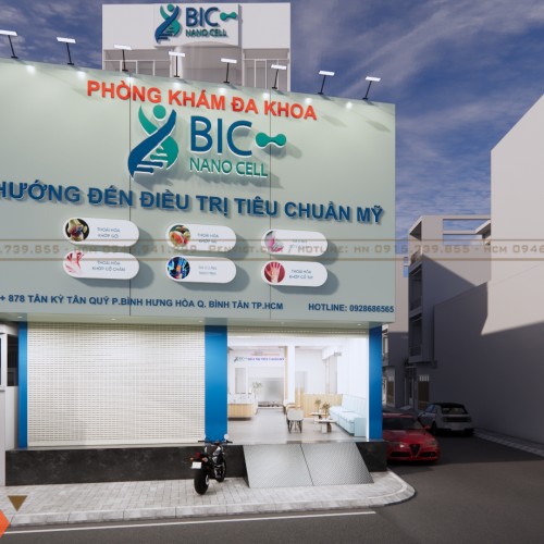 Logo và tên thương hiệu BIC Nano Cell đặt ở vị trí trung tâm, dễ nhận diện từ xa. Ngoài ra, các hạng mục điều trị được hiển thị trực quan trên bảng hiệu nhằm cung cấp thông tin nhanh cho bệnh nhân ngay từ cái nhìn đầu tiên.