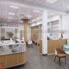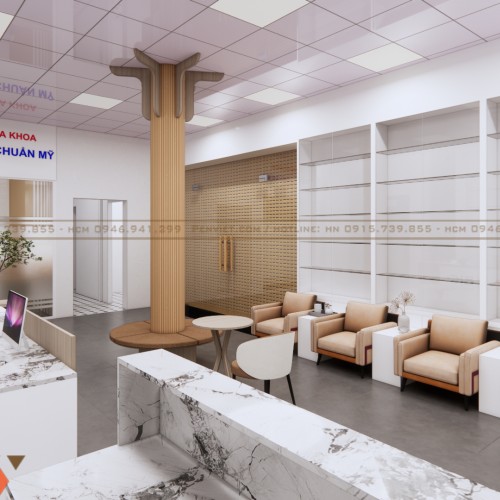 Quầy lễ tân có độ cao vừa phải, phân tách rõ khu vực nhân viên và bệnh nhân, thuận lợi cho các hoạt động tiếp nhận hồ sơ, tư vấn thủ tục. Ngay sau bàn lễ tân là khu vực làm việc của nhân viên hành chính, với thiết kế mở, tầm nhìn thoáng, giúp dễ dàng quan sát và hỗ trợ bệnh nhân khi cần thiết.