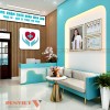 Ngay khi bước vào bên trong, khách hàng sẽ được chào đón tại khu vực lễ tân – trung tâm của phòng khám. Không gian này được thiết kế tinh tế với quầy tiếp tân hiện đại. Quầy được bố trí hợp lý, sử dụng tông màu xanh ngọc phối trắng, tạo cảm giác thân thiện nhưng không kém phần sang trọng.
