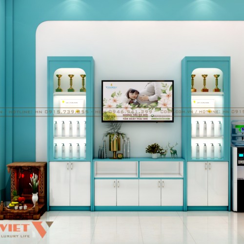Ngoài ra tại đây còn trang bị bàn tròn với chân kim loại mạ vàng tạo điểm nhấn hiện đại. Trên tường, các bức ảnh của đội ngũ bác sĩ và thông tin dịch vụ được đóng khung cẩn thận, tăng cường niềm tin cho khách hàng. Tủ trưng bày sản phẩm và các cup lưu niệm của phòng khám sản khoa.