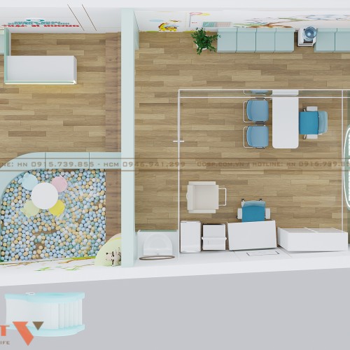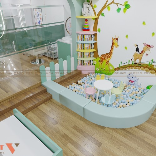 Bên phải là khu vui chơi dành cho trẻ nhỏ được trang trí với các hình vẽ động vật dễ thương. Những hình ảnh ngộ nghĩnh này giúp các bé giảm bớt đi cảm giác lo lắng khi đến thăm khám. Đồng thời tạo nên một không gian vui tươi, sinh động để các bé nô đùa trong lúc chờ đến lượt. Các chiếc ghế nhỏ xinh được bố trí bên trong nhà bóng để các bé ngồi chờ, vui chơi thỏa thích.