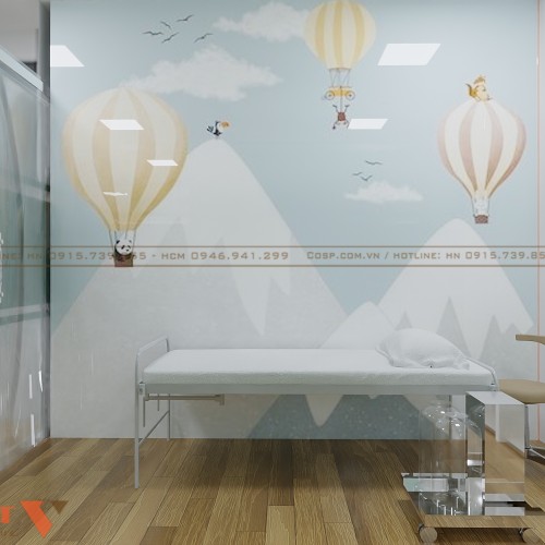 Khu vực hút mũi được thiết kế đơn giản nhưng vẫn đảm bảo đầy đủ tiện nghi cần thiết. Giường bệnh và tủ đựng dụng cụ y tế di động để bác sĩ dễ dàng thao tác và di chuyển. Trên tường phòng tiêm được trang trí bằng hình vẽ ngộ nghĩnh để các bé cảm thấy thoải mái hơn khi hút mũi.