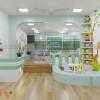 Phía bên trái lối là dãy ghế ngồi ấm cúng và thoải mái cho các phụ huynh trong khi chờ đợi được tư vấn. Kế bên là quầy thu ngân làm từ gỗ MDF cốt xanh có chiều cao hợp lý. Quầy có các đèn LED hắt sáng tạo đường viền len lỏi làm nổi bật cho khu vực này. Hơn nữa, vách logo thương hiệu phía sau quầy thu ngân không chỉ là điểm nhấn thẩm mỹ mà còn giúp tăng cường nhận diện thương hiệu.