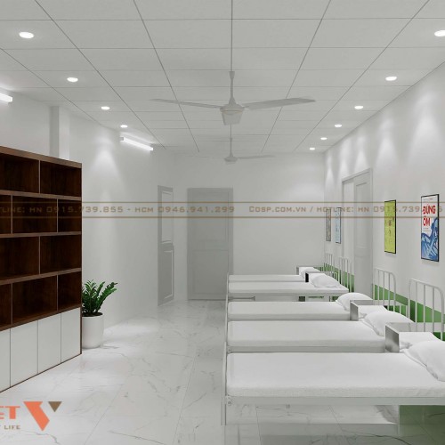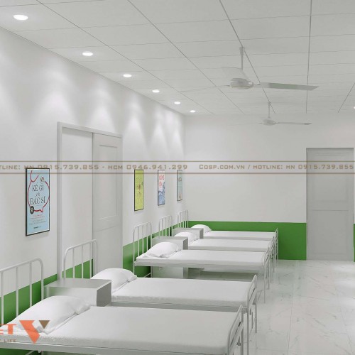 Phòng tiêm truyền dịch của thiết kế phòng khám Diệp Quân được thiết kế yên tĩnh, kín đáo, tạo không gian riêng tư cho bệnh nhân. Tại đây bố trí 5 giường bệnh, ghế ngồi và các thiết bị y tế cần thiết. Hệ thống đèn chiếu sáng vừa phải, không quá chói mắt.
