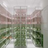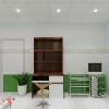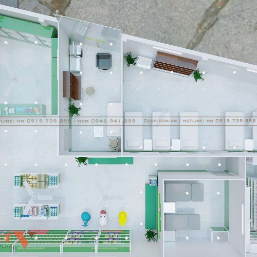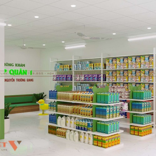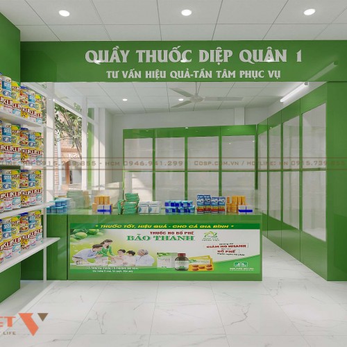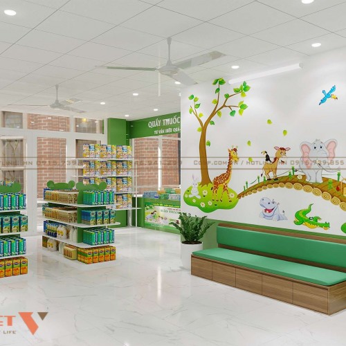 Nhà thuốc được bố trí ngay cạnh khu sảnh chờ để thuận tiện cho việc mua thuốc sau khi khám bệnh. Kệ thuốc được bố trí gọn gàng, ngăn nắp, dễ dàng tìm kiếm và lấy thuốc. Có quầy tư vấn cho khách hàng để dược sĩ có thể giải đáp thắc mắc và hướng dẫn sử dụng thuốc. Tông màu chủ đạo là xanh lá tạo cảm giác sạch sẽ và chuyên nghiệp.