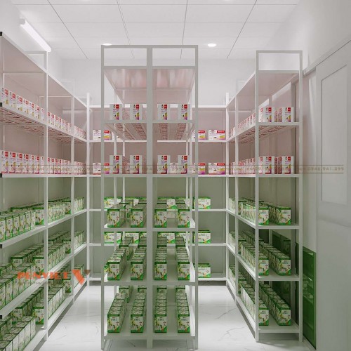 Kho thuốc được bố trí ở khu vực riêng biệt, đảm bảo an toàn với các kệ thuốc được sắp xếp ngăn nắp. Tại đây có hệ thống kiểm soát nhiệt độ và độ ẩm để bảo quản thuốc tốt nhất. Quầy kệ nhiều ngăn tầng, độ bền bỉ cao, độ bền tốt nâng cao tuổi thọ sử dụng.