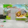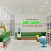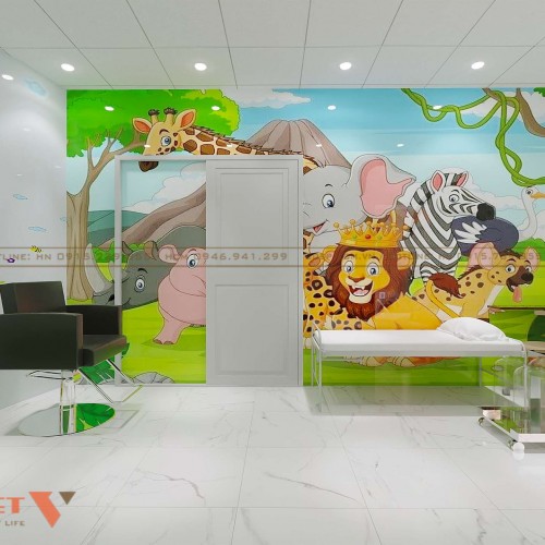 Khu sảnh chờ được thiết kế rộng rãi, thoáng mát với nhiều ghế ngồi thoải mái cho phụ huynh và các bé. Sử dụng các gam màu tươi sáng như xanh lá, vàng và hồng nhạt để tạo cảm giác vui vẻ và thân thiện. Trên tường trang trí các hình ảnh hoạt hình dễ thương, giúp trẻ em cảm thấy thoải mái và bớt lo lắng. Hệ thống đèn LED chiếu sáng trắng tạo không gian sáng sủa và dễ chịu.