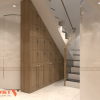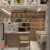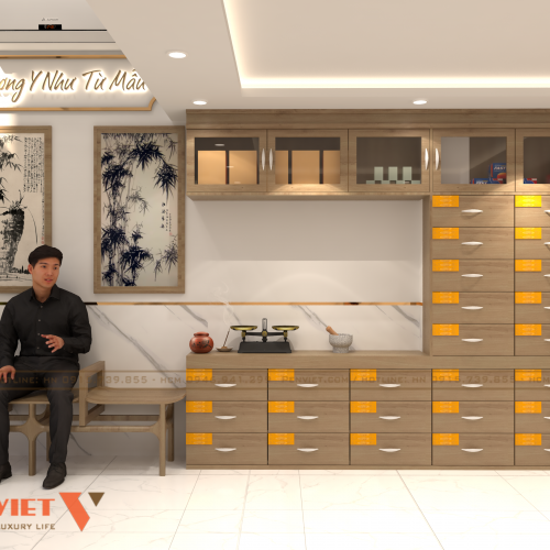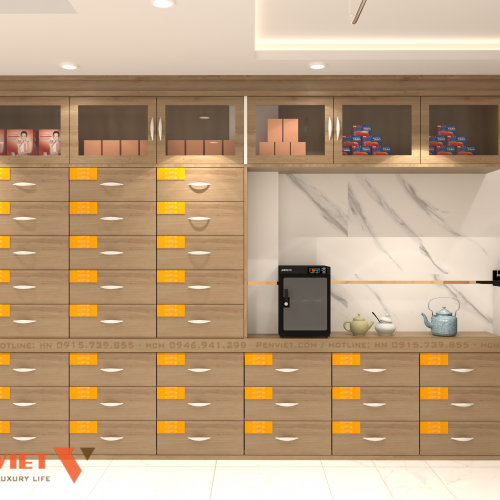 Một trong những điểm nhấn đặc biệt của phòng khám đông y Nhân Khang chính là khu vực bày trí thuốc đông y và sản phẩm hỗ trợ điều trị. Hệ thống tủ kệ gỗ được thiết kế riêng, kết hợp đèn LED chiếu sáng nhẹ nhàng nhằm làm nổi bật các sản phẩm. Các loại thuốc được sắp xếp cẩn thận theo từng danh mục, không chỉ giúp bệnh nhân dễ dàng tìm kiếm mà còn làm tăng tính thẩm mỹ cho không gian.