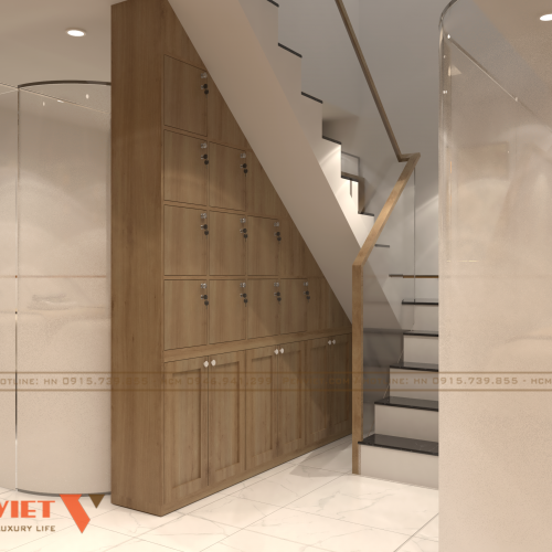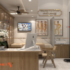 Ngay khi bước vào phòng khám, bệnh nhân sẽ bị thu hút bởi khu vực tiếp tân với thiết kế tinh tế và chuyên nghiệp. Quầy tiếp tân được làm từ gỗ tự nhiên kết hợp mặt đá hoa cương bóng loáng, vừa sang trọng vừa thân thiện. Tấm logo được đặt phía sau quầy với ánh sáng đèn LED âm tường, tạo điểm nhấn thương hiệu đồng thời mang lại cảm giác uy tín.