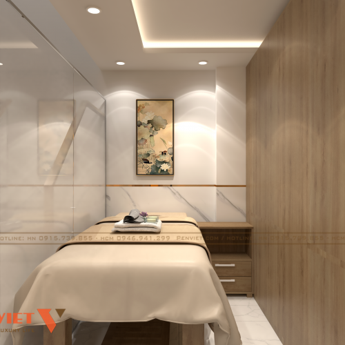 Không gian phòng điều trị được thiết kế với sự ưu tiên hàng đầu cho sự riêng tư và thoải mái. Mỗi phòng được ngăn cách bằng vách gỗ hoặc rèm kéo mềm mại, vừa đảm bảo tính tế nhị vừa mang lại cảm giác yên bình cho bệnh nhân.