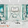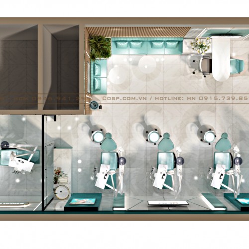 Bên cạnh đó, thiết kế cũng tuân theo yếu tố phong thủy như lối đi thông thoáng, quầy lễ tân hướng ra cửa chính đón tài lộc, ghế điều trị quay lưng vào tường chắc chắn…