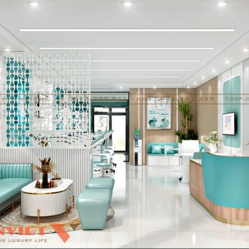 Tổng thể không gian phòng khám được chia thành nhiều khu vực chức năng rõ ràng, đảm bảo sự liền mạch trong bố cục và thuận tiện di chuyển. Phong cách thiết kế hiện đại, sử dụng gam màu chủ đạo là trắng kết hợp xanh ngọc.