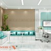Đối diện khu lễ tân là khu vực tiếp khách với ghế sofa bọc da cao cấp màu xanh pastel, bàn trà mặt đá sang trọng và tấm thảm lông trang trí. Không gian này còn được trang trí bằng chậu cây xanh và tủ trưng bày nhỏ. Khách hàng sẽ nhận được sự tư vấn tận tình của nhân viên phòng khám khi đến sử dụng dịch vụ.