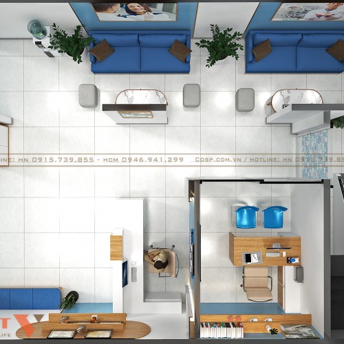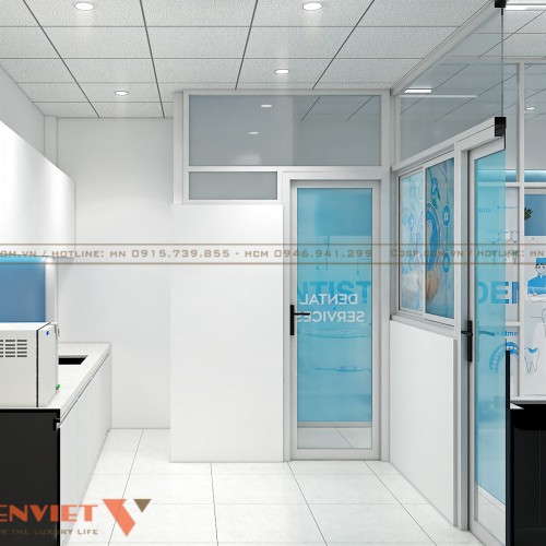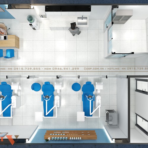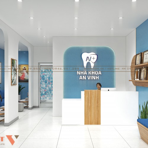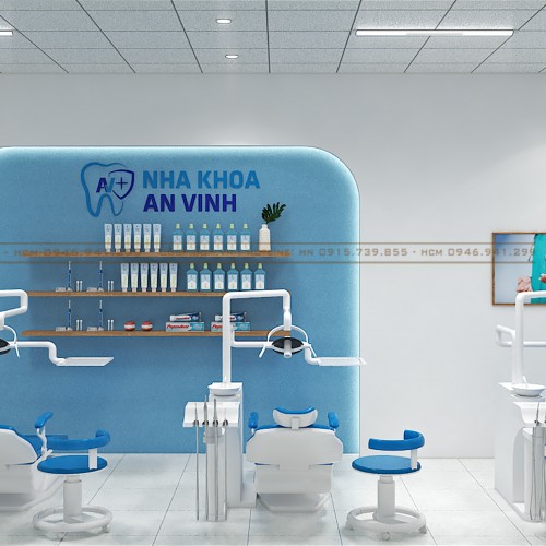 Thiết kế phòng khám nha khoa An Hưng có sự kết hợp hoàn hảo giữa công năng và thẩm mỹ. Tông màu xanh lam và trắng kết hợp, mang lại cảm giác sạch sẽ, chuyên nghiệp, thông thoáng. Các khu vực được bố trí logic, giúp dễ dàng di chuyển và tăng hiệu suất làm việc. Tất cả các chi tiết trong thiết kế, từ nội thất đến bố cục không gian, đều được tính toán kỹ lưỡng để mang lại trải nghiệm tốt nhất cho khách hàng.