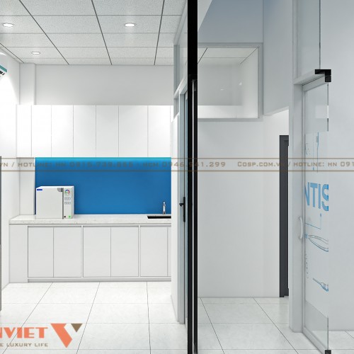 Phía sau phòng khám là khu vực chuẩn bị vật liệu và dụng cụ nha khoa. Khu vực này được bố trí rõ ràng, giúp tối ưu hóa quy trình hoạt động. Tủ chứa được thiết kế đơn giản làm từ gỗ MDF cốt xanh với ngăn kéo và cánh cửa đặt gọn gọn.
