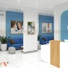 Khu chờ cho khách hàng sắp xếp 2 bộ ghế sofa màu xanh lam, phù hợp với tổng thể màu sắc hiện đại của phòng khám. Đây là nơi để quý khách ngồi chờ thư giãn và được nhân viên tư vấn hỗ trợ ban đầu. Bàn trà mặt đá nẹp viền inox tạo điểm nhấn cho không gian.