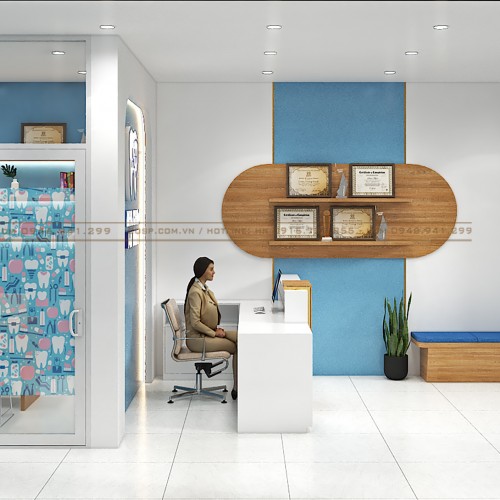 Ngay khi bước vào phòng khám, bạn sẽ gặp khu vực sảnh chờ thiết kế tinh tế với không gian thoáng đãng. Quầy lễ tân được đặt ở vị trí trung tâm, nhằm tăng tính thuận tiện cho việc tiếp đón khách hàng. Quầy lễ được làm bằng gỗ MDF cốt xanh sáng màu. Phía trên quầy, máy tính, điện thoại, và các tài liệu cần thiết được sắp xếp gọn gàng.