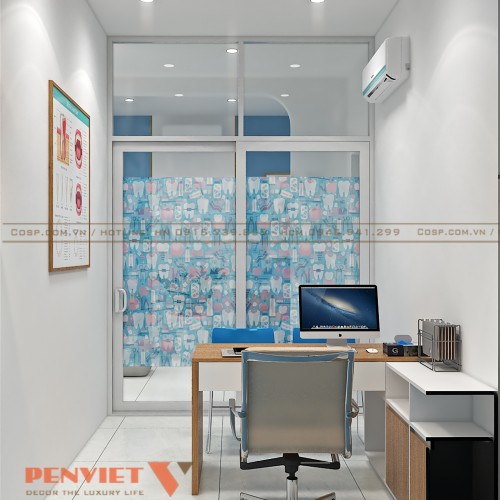 Mỗi ghế khám được thiết kế màu xanh lam đậm, kèm theo bàn thiết bị nha khoa đặt bên cạnh. Khu vực này được phân cách với bàn tư vấn bên ngoài bởi vách ngăn trong suốt, đảm bảo không gian riêng tư mà không gây cảm giác chật chội. PenViet sử dụng vách ngăn trong suốt tạo độ thông thoáng, đồng thời giúp duy trì độ tương tác giữa bác sĩ và khách hàng.