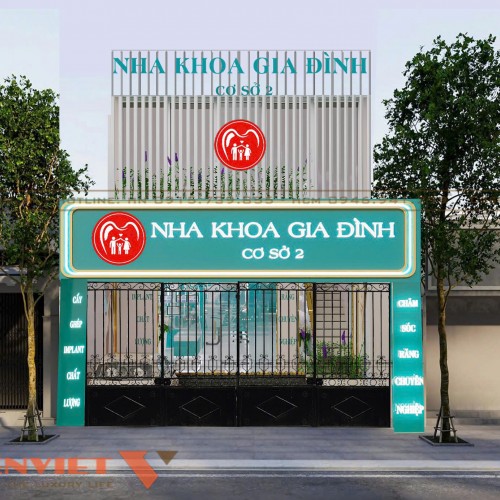 Mặt tiền của phòng khám được thiết kế nổi bật với bảng hiệu kích thước lớn, nền xanh ngọc mang tính thương hiệu. Kết hợp với các viền vàng đồng tạo cảm giác sang trọng và uy tín. Logo hình biểu tượng gia đình cách điệu màu đỏ nổi bật ngay trung tâm giúp người đi đường dễ dàng nhận diện thương hiệu. Dòng chữ "NHA KHOA GIA ĐÌNH – CƠ SỞ 2" được thiết kế với font chữ sắc nét, rõ ràng, độ tương phản cao so với nền đảm bảo khả năng quan sát từ xa.