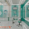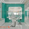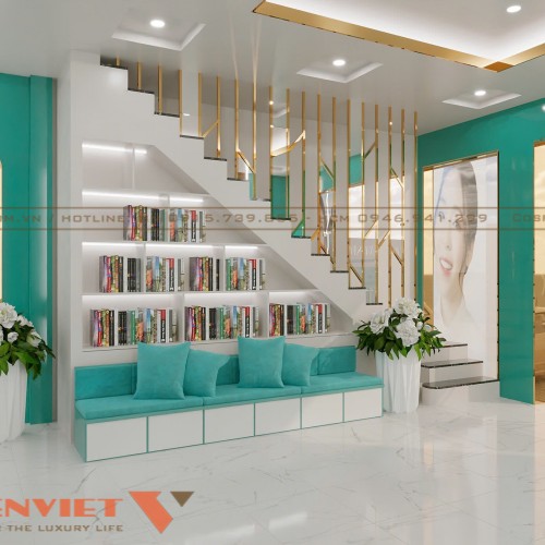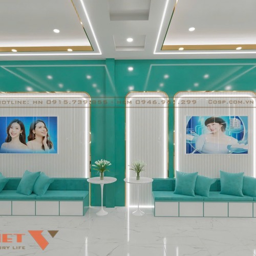 Tông xanh ngọc tiếp tục được sử dụng xuyên suốt không gian nhằm tạo sự đồng bộ thương hiệu. Màu xanh mang lại cảm giác dịu mắt, thư giãn mà còn thể hiện tính chuyên nghiệp, y tế. Kết hợp cùng nền trắng và các đường chỉ vàng ánh kim, tổng thể tạo nên sự thanh lịch, hiện đại.