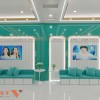 Tủ trưng bày giải thưởng và bảng thông tin điện tử tích hợp thể hiện sự minh bạch và uy tín của đơn vị khám chữa. Hoa tươi và cây xanh bố trí ở hai đầu quầy tiếp tân, giúp cân bằng thị giác và tạo cảm giác thư giãn. Không gian lễ tân đáp ứng tốt chức năng đón tiếp và tạo cảm giác tin tưởng, an tâm cho khách hàng.