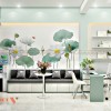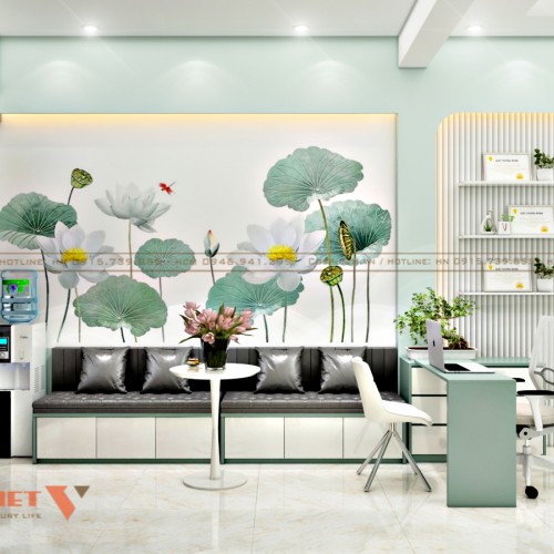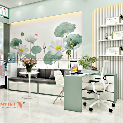 Phía sau khu vực này là bức tranh lớn với chủ đề hoa sen - biểu tượng của sự thanh cao, tĩnh lặng. Tranh vẽ hoa sen sử dụng gam màu trắng, xanh lá cây, vàng nhạt tinh tế tạo cảm giác thanh bình và trang nhã. Hoa sen tượng trưng cho vẻ đẹp tự nhiên, giúp xóa tan căng thẳng cho khách hàng trong quá trình chờ đợi. Vừa là biểu tượng của sự tinh khiết vừa mang ý nghĩa gắn liền với sự uy tín và cẩn trọng trong dịch vụ của phòng khám.