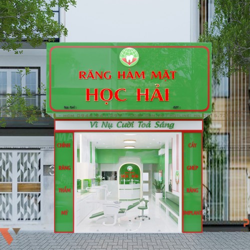 Biển bảng quảng cáo phòng khám nha khoa Học Hải nổi bật với gam màu xanh lá cây chủ đạo, tạo cảm giác thân thiện, tươi mới. Có thiết kế hình chữ nhật bên trong là đường viền đỏ bo tròn nhẹ mềm mại. Màu xanh lá cây tượng trưng cho sự an toàn và sức sống phù hợp với lĩnh vực nha khoa. Trên nền xanh, dòng chữ "Răng Hàm Mặt Học Hải" bằng mica gam có màu đỏ đậm. Hệ thống đèn LED chiếu sáng quanh biển bảng làm cho các chữ và logo nổi bật hơn vào buổi tối, đảm bảo hiệu quả quảng cáo suốt 24/7.