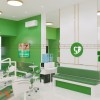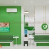 Ngay từ cái nhìn đầu tiên, phòng khám Học Hải tạo ấn tượng mạnh mẽ với thiết kế tông màu xanh lá cây chủ đạo. Điểm nhấn trong khu vực đón khách chính là hai dãy ghế chờ màu xanh lá cây phối trắng được đặt cạnh bàn tròn nhỏ để khách có thể thư giãn khi chờ đợi. Tất cả được sắp xếp hợp lý nhằm tối ưu hóa trải nghiệm của khách hàng khi đến điều trị nha khoa.