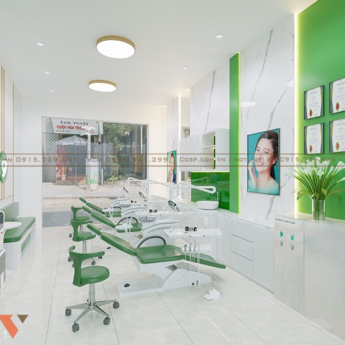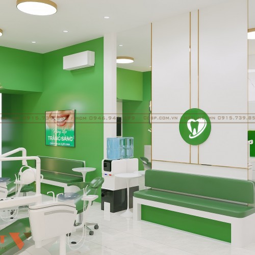 Không gian này được bố trí gọn gàng, sạch sẽ với bàn lễ tân để khách hàng dễ dàng nhận sự hỗ trợ từ nhân viên. Hai bên quầy là những hình ảnh quảng bá dịch vụ của phòng khám, bằng cấp chứng nhận liên quan. Đây là cách gia tăng sự uy tín của thương hiệu phòng khám để khách hàng lựa chọn chăm sóc răng miệng.