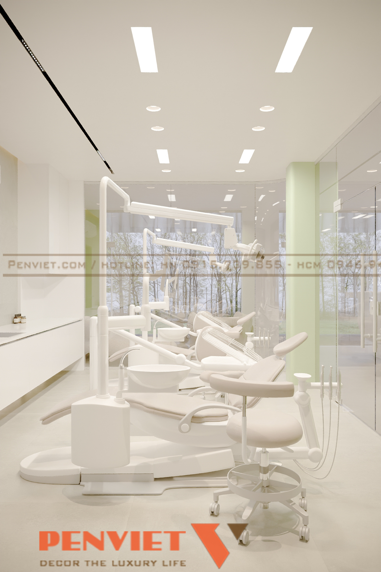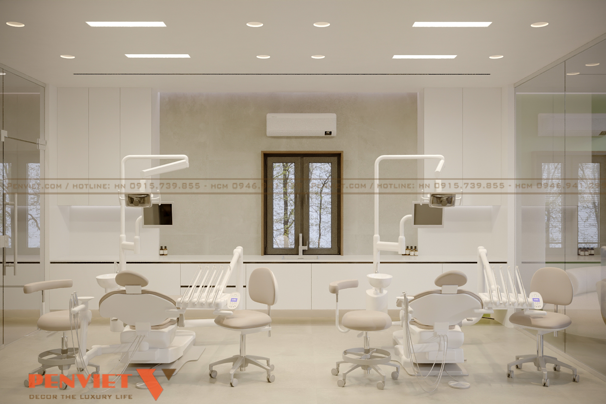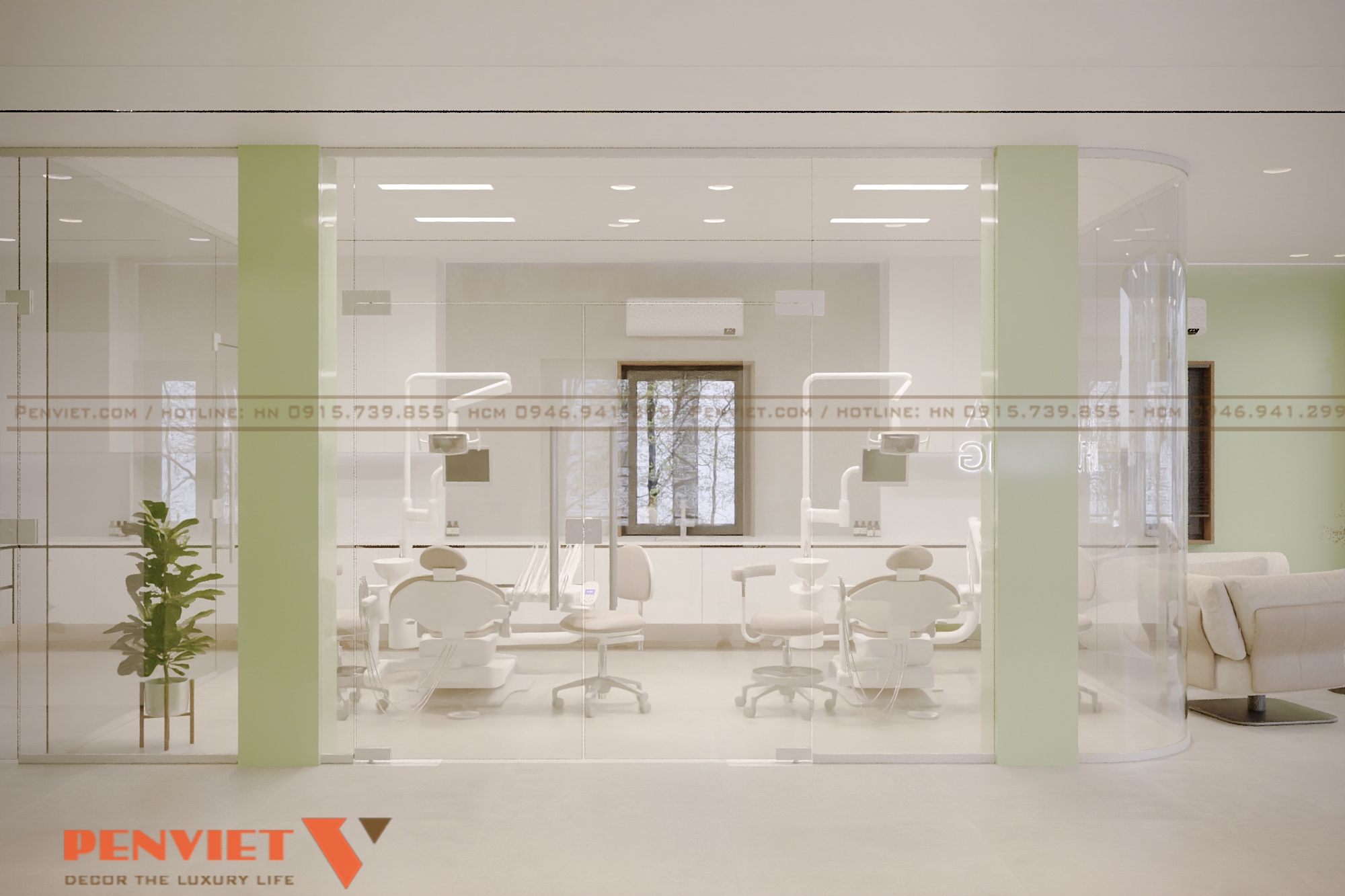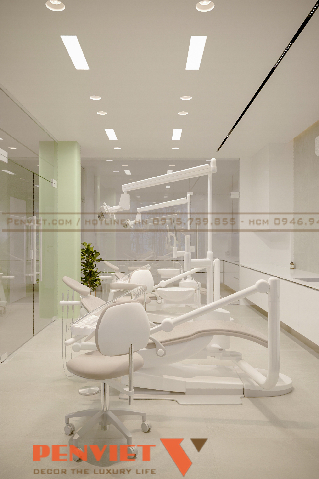 Nhờ thiết kế vách kính trong suốt, phòng điều trị giữ được sự riêng tư cần thiết nhưng vẫn tạo cảm giác rộng mở và sáng thoáng. Ánh sáng tự nhiên được khai thác tối đa qua các ô cửa lớn, mang đến không gian dễ chịu, giúp bệnh nhân bớt lo lắng trong khi bác sĩ có thể quan sát tình trạng răng miệng rõ nét hơn dưới nguồn sáng chất lượng cao. Sự kết hợp giữa tiện nghi, công nghệ và thẩm mỹ giúp phòng điều trị đạt chuẩn chuyên môn lẫn trải nghiệm dịch vụ.