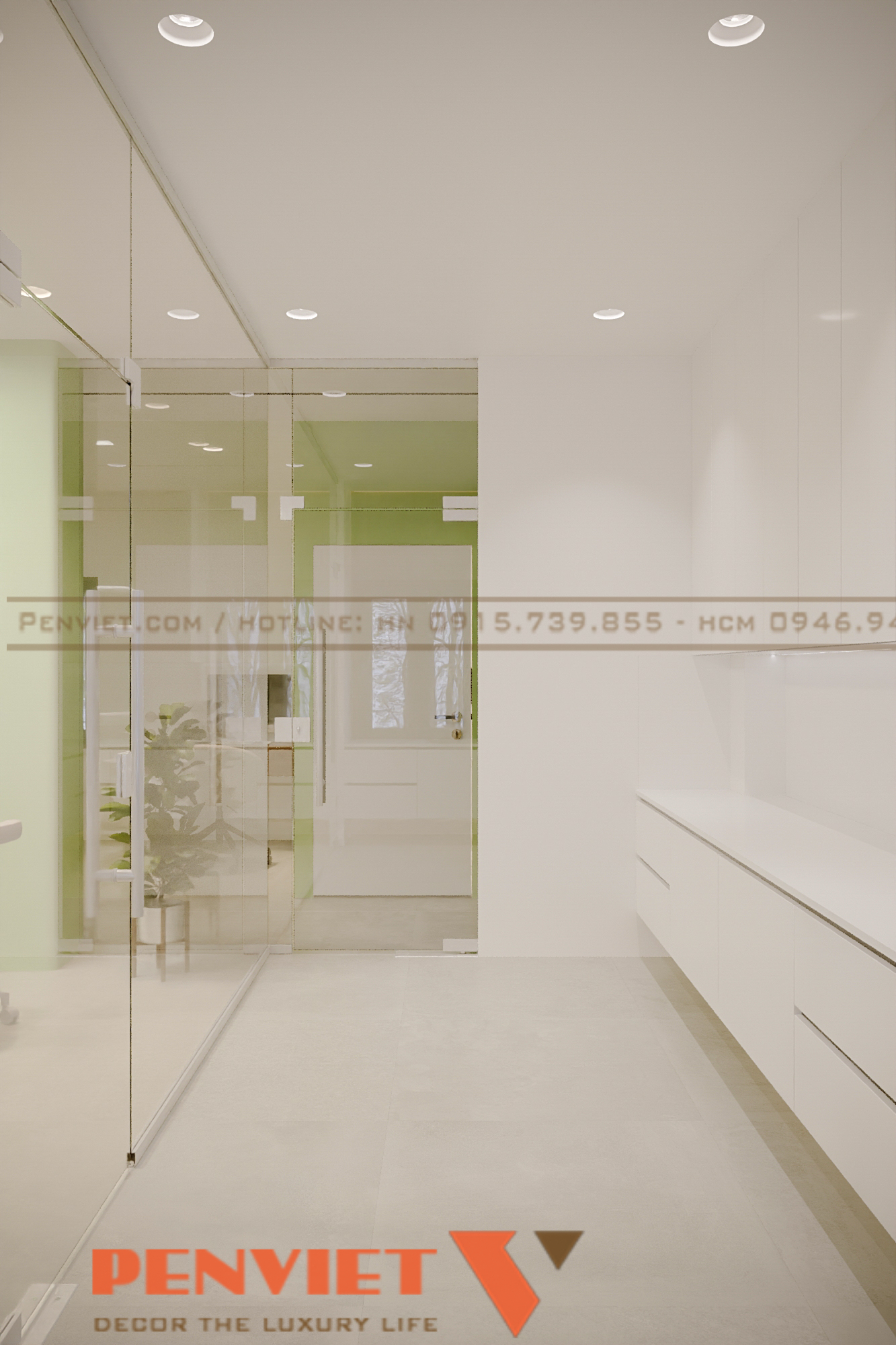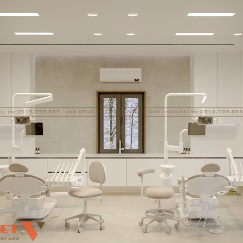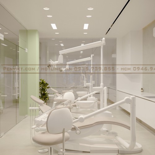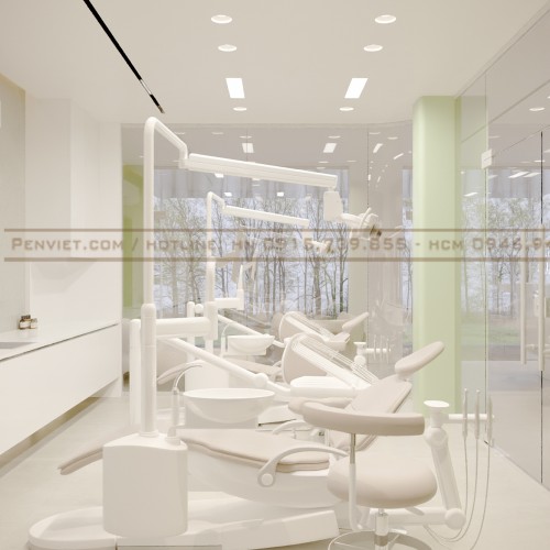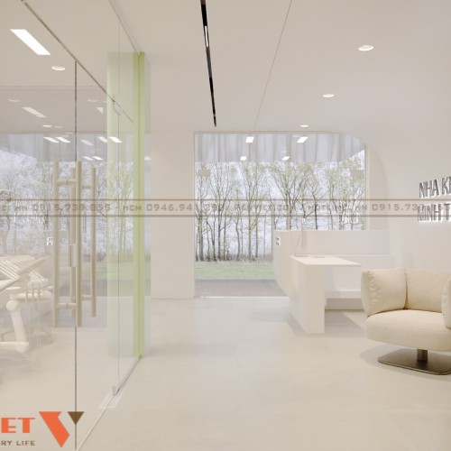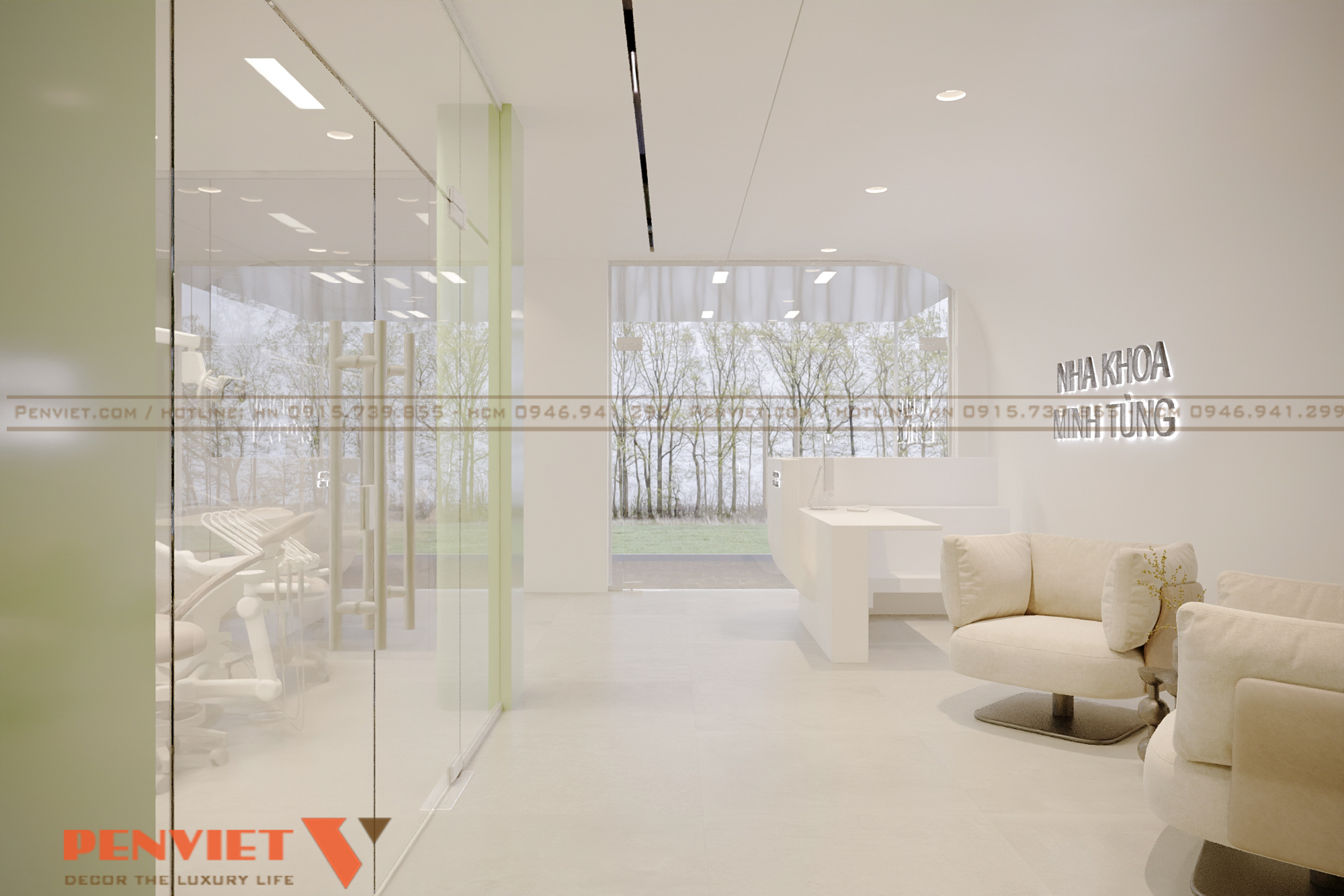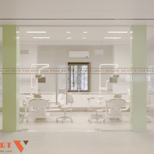 Nhờ thiết kế vách kính trong suốt, phòng điều trị giữ được sự riêng tư cần thiết nhưng vẫn tạo cảm giác rộng mở và sáng thoáng. Ánh sáng tự nhiên được khai thác tối đa qua các ô cửa lớn, mang đến không gian dễ chịu, giúp bệnh nhân bớt lo lắng trong khi bác sĩ có thể quan sát tình trạng răng miệng rõ nét hơn dưới nguồn sáng chất lượng cao. Sự kết hợp giữa tiện nghi, công nghệ và thẩm mỹ giúp phòng điều trị đạt chuẩn chuyên môn lẫn trải nghiệm dịch vụ.