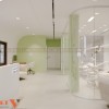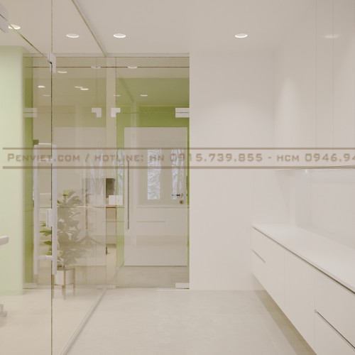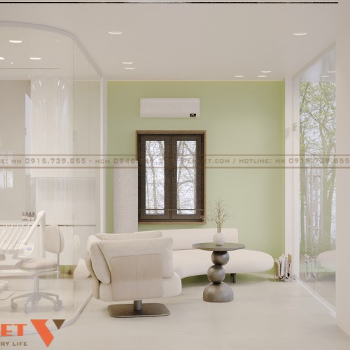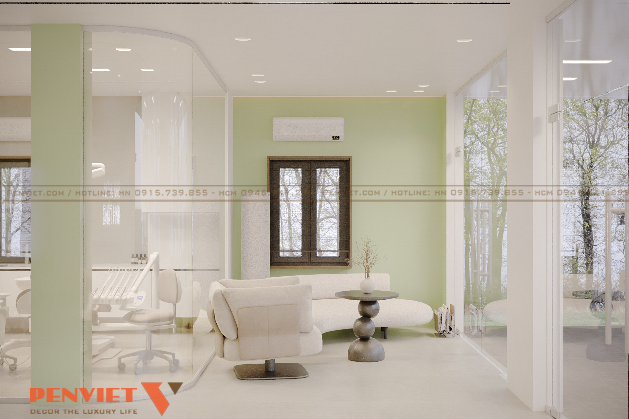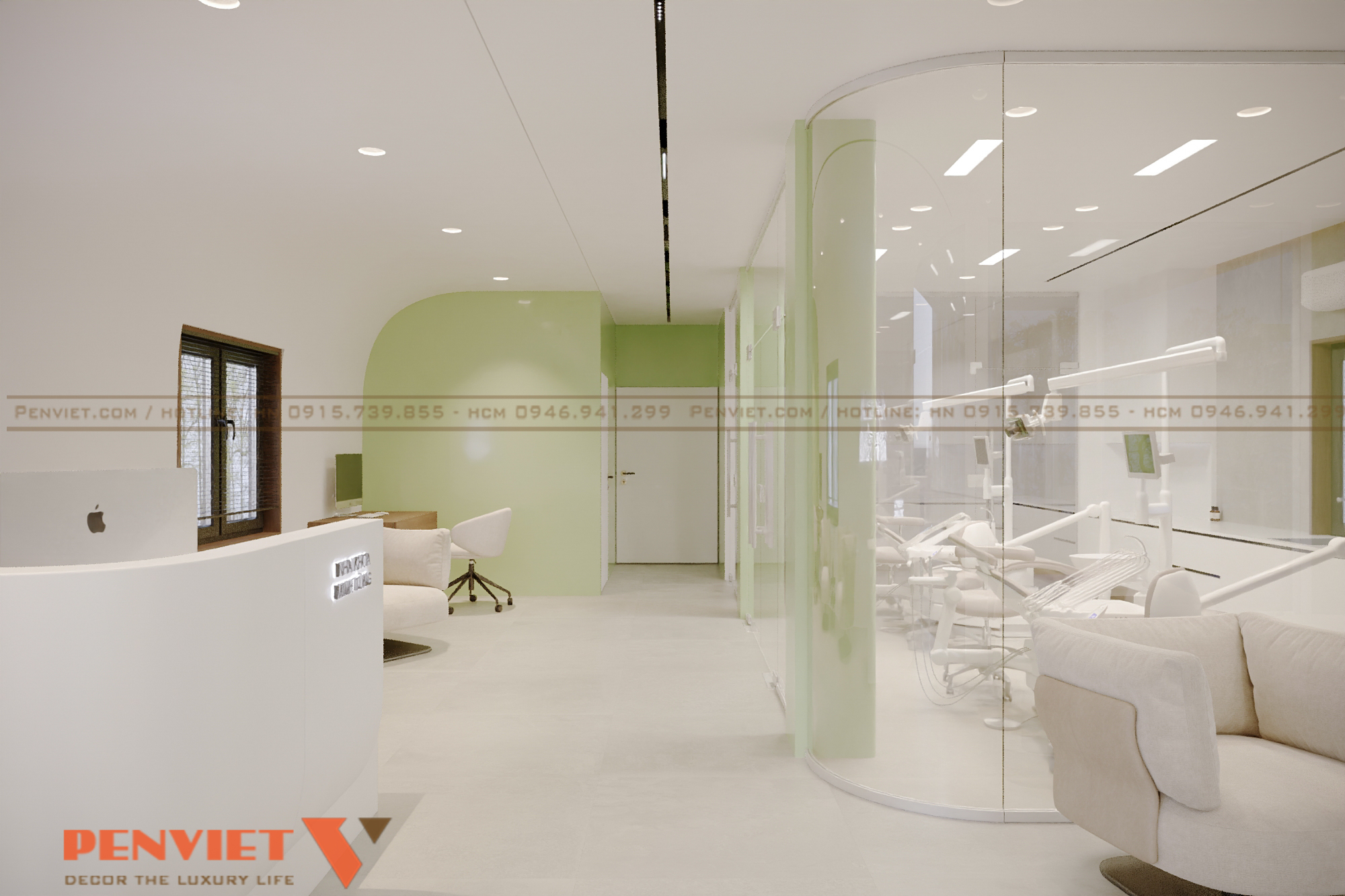 Lựa chọn màu sắc là một yếu tố mang tính quyết định đến cảm xúc của bệnh nhân. Gam xanh mint được triển khai xuyên suốt trong dự án để mang tới cảm giác nhẹ nhàng, an tâm và tươi mới, giúp bệnh nhân giảm bớt căng thẳng khi đối diện với các thủ thuật nha khoa. Tường được bo cong ở nhiều vị trí chuyển tiếp giữa các khu vực nhằm loại bỏ sự khô cứng, góp phần tạo nên không gian mềm mại và cuốn hút hơn về mặt thị giác. Từ đó, phòng khám không còn mang cảm giác nặng nề như những cơ sở y tế truyền thống mà trở thành nơi chăm sóc sức khỏe dễ chịu và thân thiện.