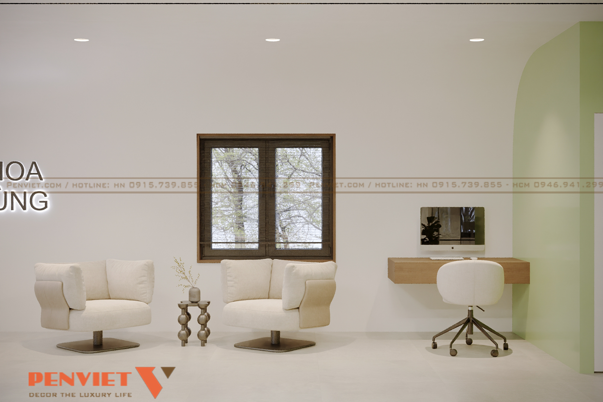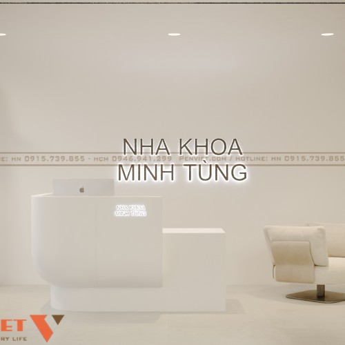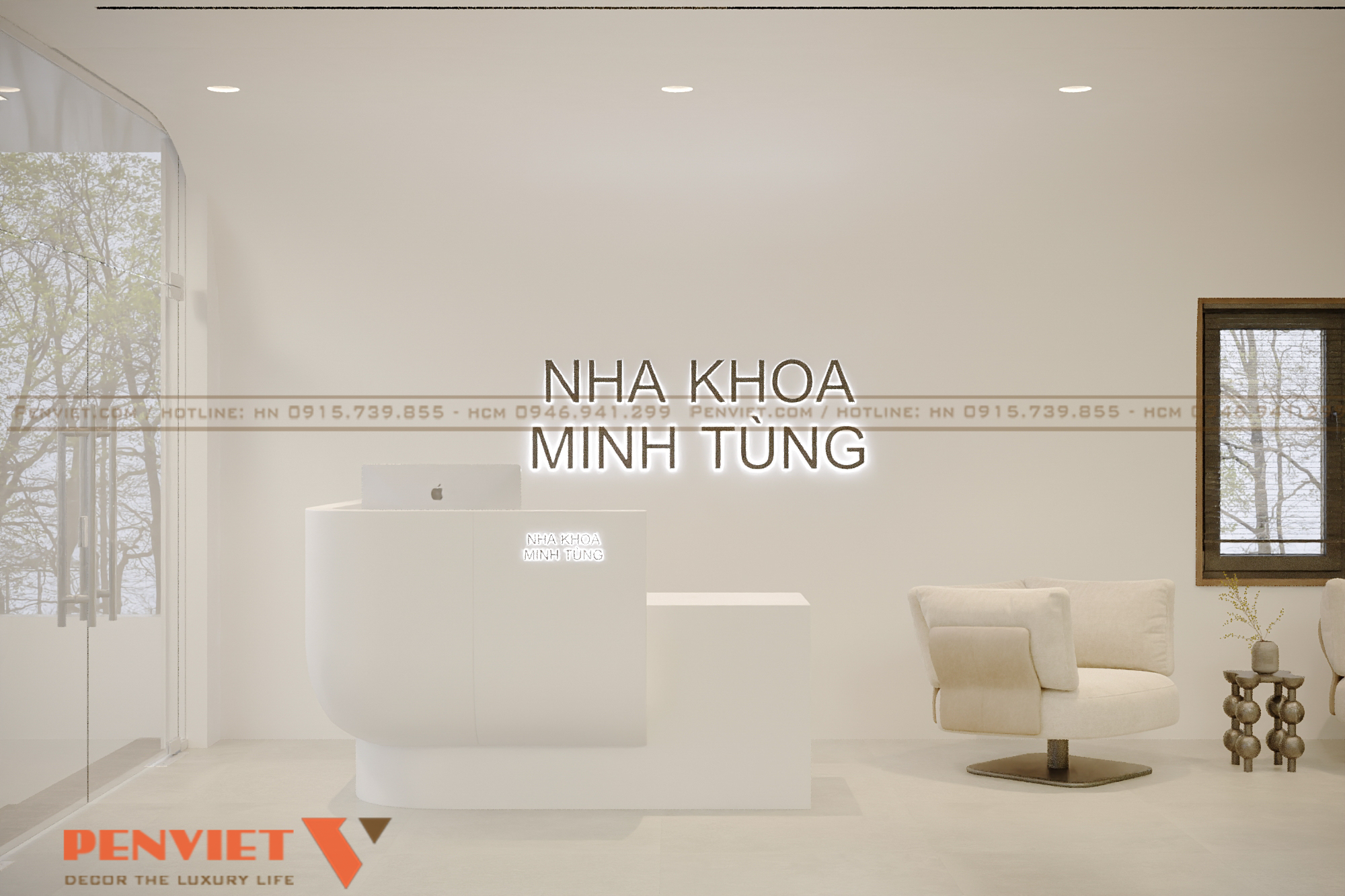 Lễ tân được xem là tâm điểm của trải nghiệm khách hàng và là khu vực đầu tiên truyền tải phong cách vận hành của phòng khám. Trong dự án thiết kế phòng khám nha khoa Minh Tùng, quầy lễ tân được thiết kế với những đường cong mềm mại, vừa mang lại cảm giác tinh tế vừa góp phần tạo sự gần gũi, thân thiện cho khách hàng khi giao tiếp với nhân viên. Khu vực chờ bố trí ghế sofa êm ái với khoảng cách thoáng đãng, kết hợp cùng ánh sáng dịu nhẹ, giúp bệnh nhân trở nên thư giãn hơn trước khi bước vào quá trình điều trị.