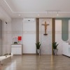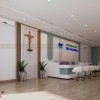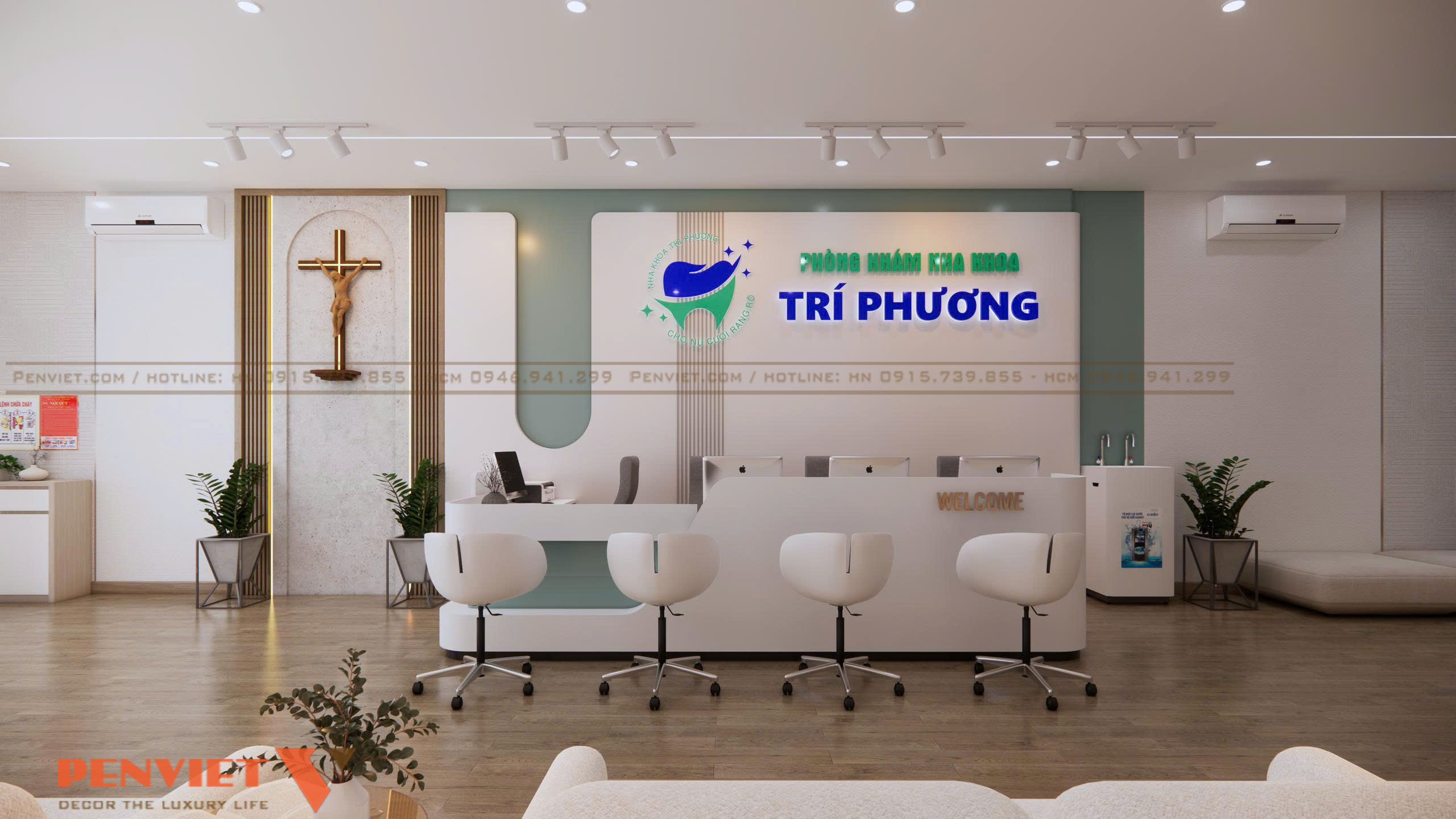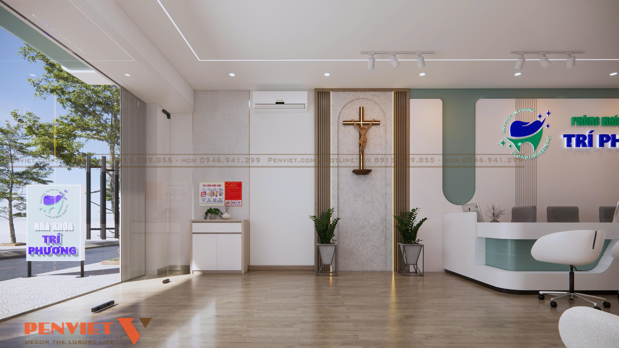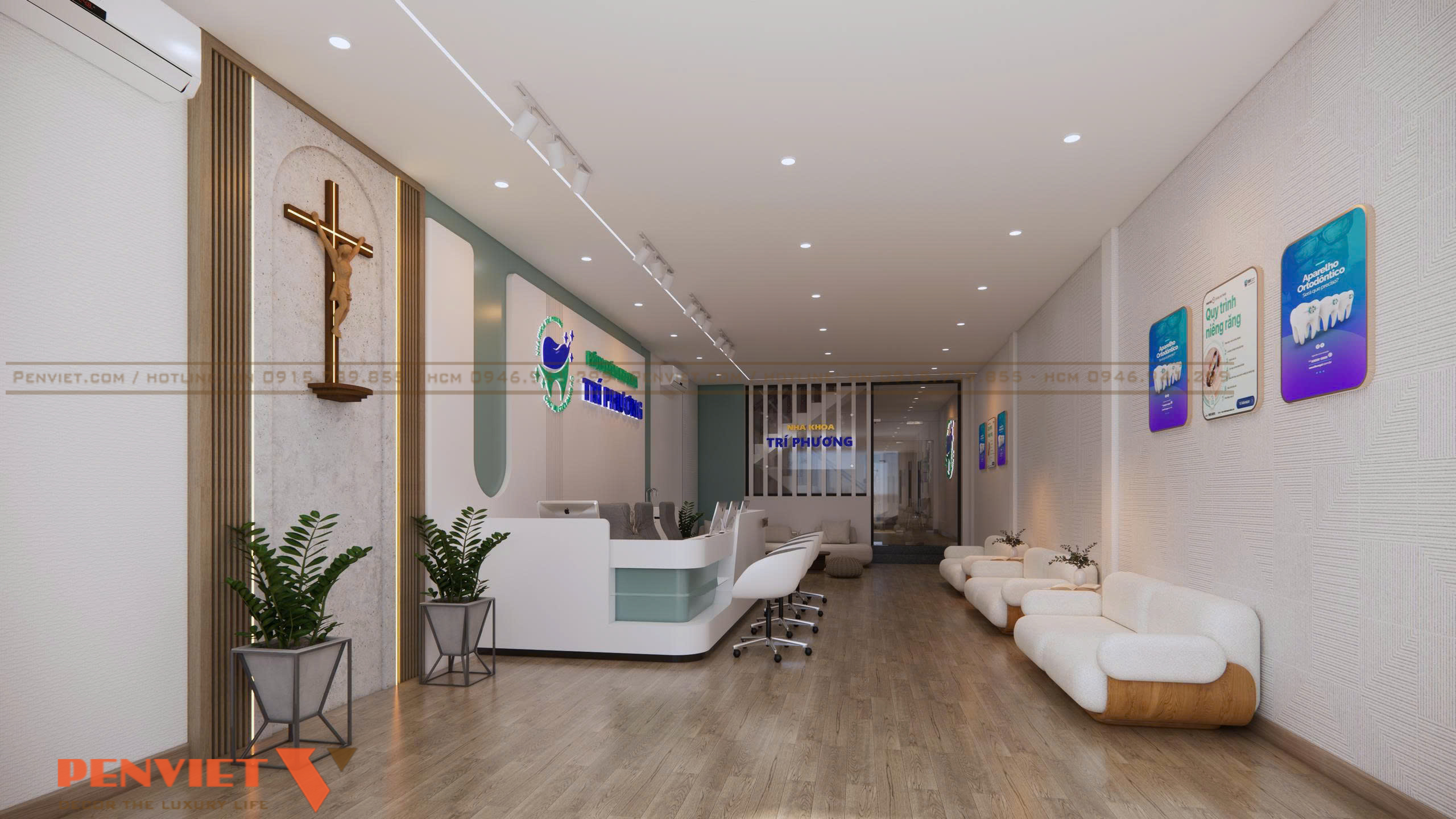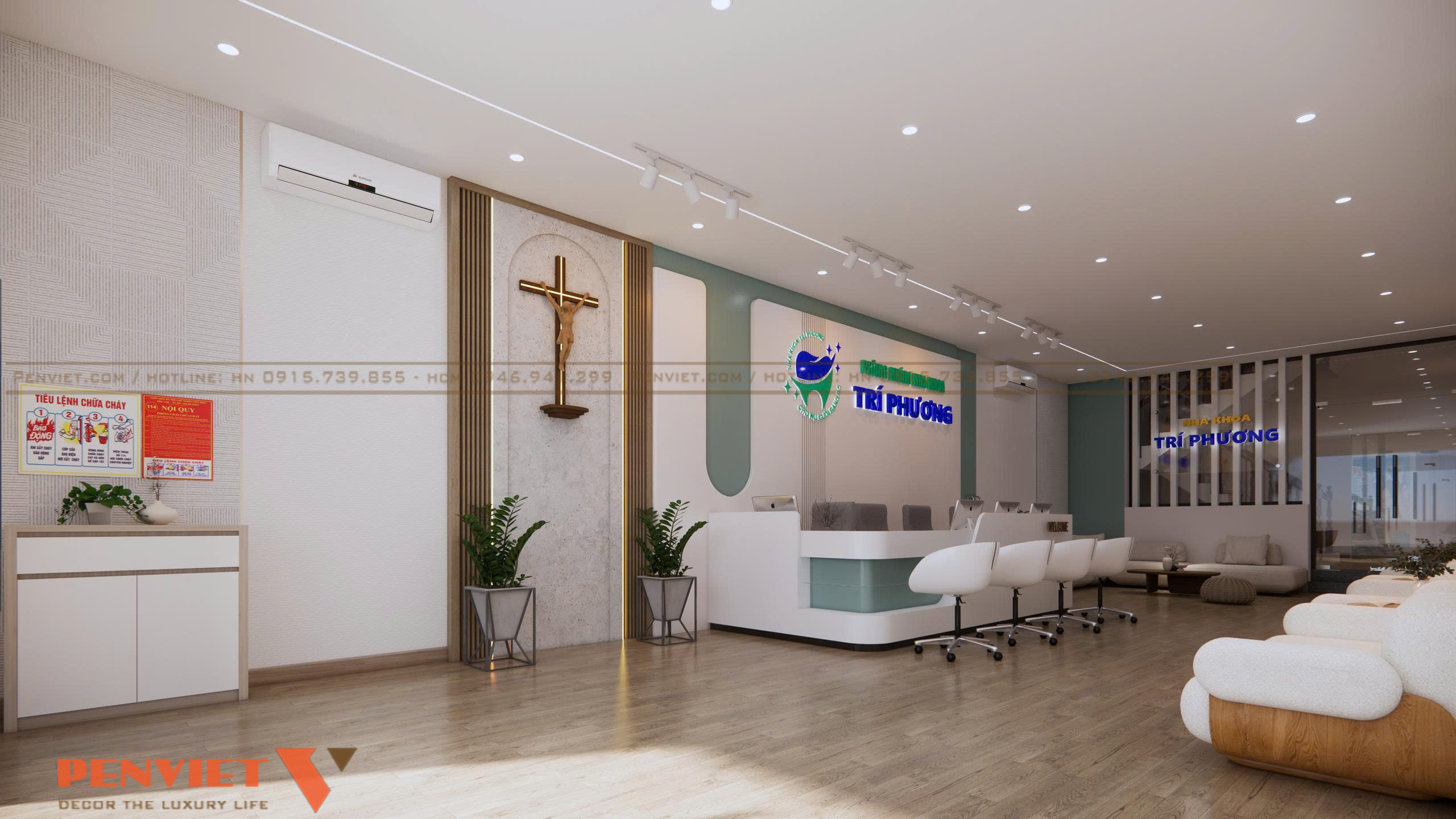 Đặc biệt, việc bố trí biểu tượng thánh giá bằng gỗ trên tường tạo điểm nhấn trang nghiêm, thể hiện tinh thần nhân văn và niềm tin trong hoạt động y khoa. Từng chi tiết nội thất như chậu cây xanh, vách lam gỗ, vật liệu tường 3D đều góp phần tăng tính thẩm mỹ và mang đến cảm giác dễ chịu cho khách hàng ngay từ giây phút đầu tiên.